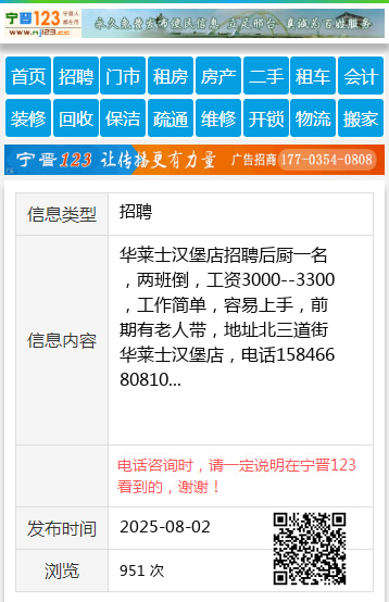 华莱士汉堡店招聘后厨一名,两班倒,工资3000--3300,工作简单,容易上手,前期有老人带,地址北三道街华莱士汉堡店,电话15846680810 【电话咨询时,请一定说明在望奎信息网看到的,谢谢!】 |