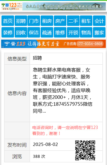 急聘生鲜水果电商客服,女生,电脑打字速度快、服务意识强,能耐心处理客诉,有客服经验优先,适应早晚班,薪资2000+,月休1天,联系方式:18745579755微信同号 【电话咨询时,请一定说明在望奎信息网看到的,谢谢!】 |