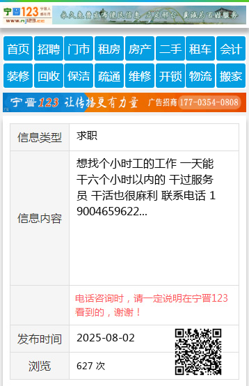 想找个小时工的工作 一天能干六个小时以内的 干过服务员 干活也很麻利 联系电话 19004659622