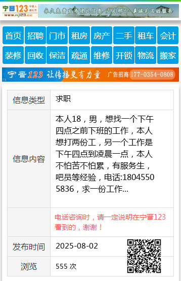 本人18,男,想找一个下午四点之前下班的工作,本人想打两份工,另一个工作是下午四点到凌晨一点,本人不怕苦不怕累,有服务生,吧员等经验,电话:18045505836,求一份工作