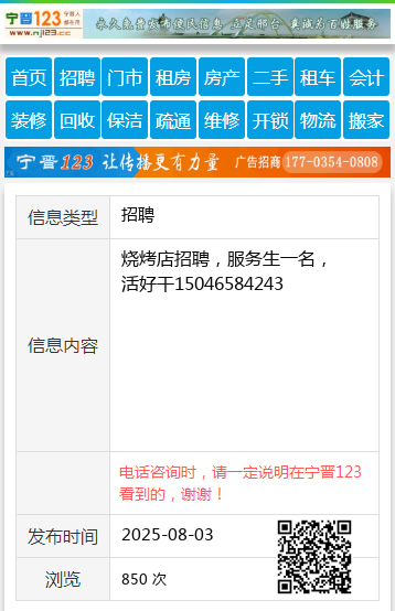烧烤店招聘,服务生一名,活好干15046584243