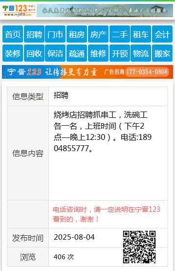 烧烤店招聘抓串工,洗碗工各一名,上班时间(下午2点—晚上12:30)。电话:18904855777。