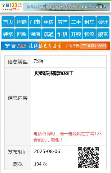 大龙小串北六店招聘服务员一名 电话15046587321