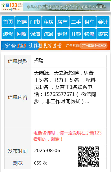 天阔源、天之源招聘:男普工5 名,男力工 5 名 ,配料员1 名 ,女普工1名联系电话:15765577671( 微信同步 ,非工作时间勿扰) 【电话咨询时,请一定说明在望奎信息网看到的,谢谢!】 |