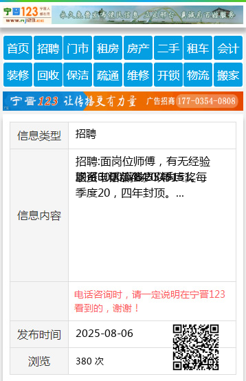 招聘:面岗位师傅,有无经验均可,年龄45岁以内