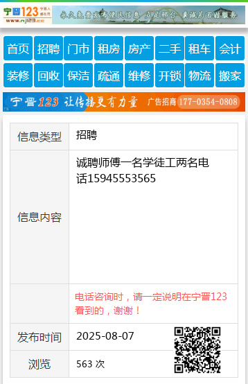 诚聘师傅一名学徒工两名电话15945553565
