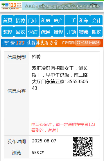 双汇冷鲜肉招聘女工,能长期干,早中午供饭,南三路大厅门东第五家13555350543