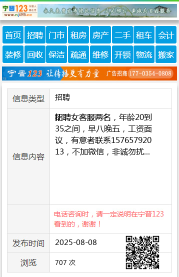 招聘女客服两名,年龄20到35之间,早八晚五,工资面议,有意者联系15765792013,不加微信,非诚勿扰 【电话咨询时,请一定说明在望奎信息网看到的,谢谢!】 |