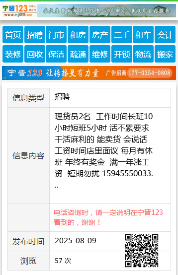 理货员2名 工作时间长班10小时短班5小时 活不累要求干活麻利的 能卖货 会说话 工资时间店里面议 每月有休班 年终有奖金 满一年涨工资 短期勿扰 15945550033 【电话咨询时,请一定说明在望奎信息网看到的,谢谢!】 |