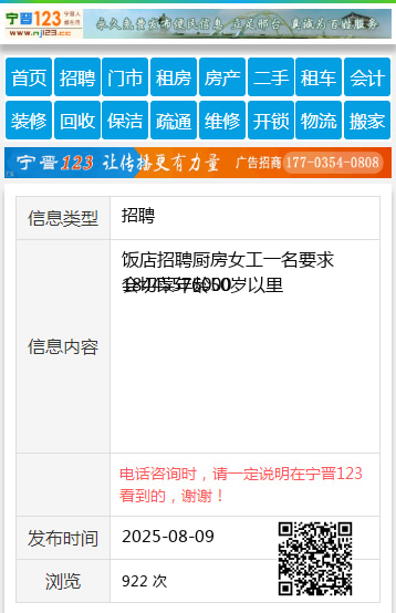 饭店招聘厨房女工一名要求会切菜年龄50岁以里 18445576000