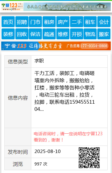 干力工活,装卸工,电镐砸墙室内外拆除,搬搬抬抬,扛楼,搬家等等各种小零活,电动三轮车出租,拉货,拉脚,联系电话15945551104
