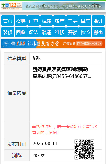连海手机招聘服务员3名,男女不限,年龄18-45岁,工资待遇优厚,面谈。要求长期工作,诚实守信,吃苦耐劳。电话:18945541555(微信同