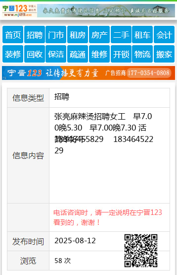 张亮麻辣烫招聘女工 早7.00晚5.30 早7.00晚7.30 活简单好干