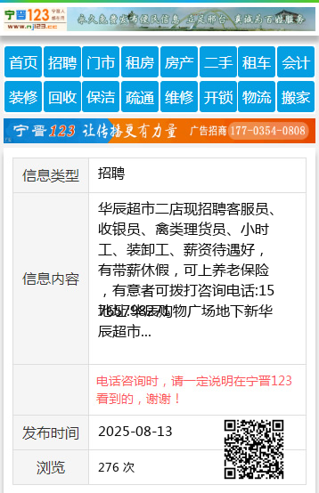 华辰超市二店现招聘客服员、收银员、禽类理货员、小时工、装卸工、薪资待遇好,有带薪休假,可上养老保险,有意者可拨打咨询电话:15765798271