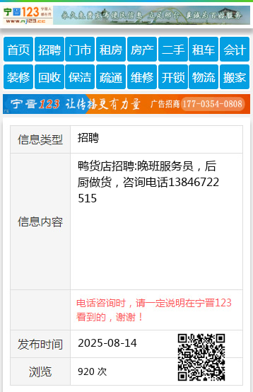 鸭货店招聘:晚班服务员,后厨做货,咨询电话13846722515