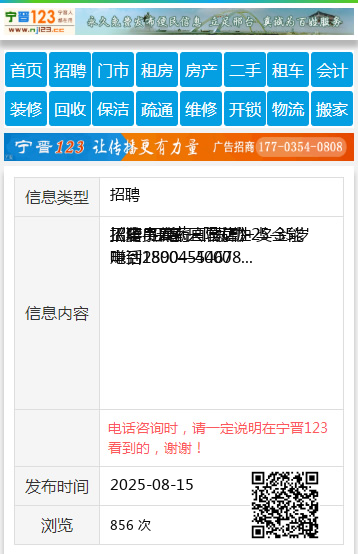 | 防骗提醒: | 望奎信息网(www.wangkui.cc)提醒您:手工活、网络兼职、刷单,都是骗子!凡以各种名义收取费用的都是骗子!找工作是往兜里挣钱,让你往外掏钱的都是骗子!异地招聘请提高警惕,谨防诈骗! |