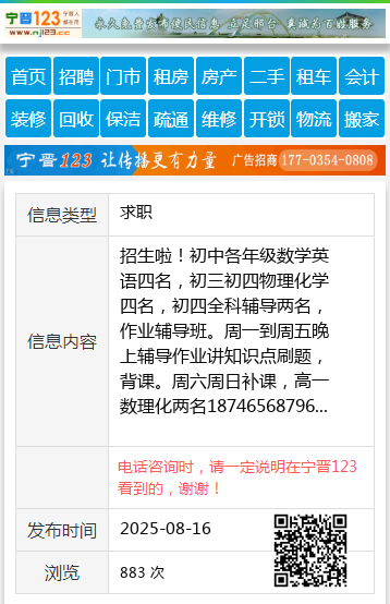 招生啦!初中各年级数学英语四名,初三初四物理化学四名,初四全科辅导两名,作业辅导班。周一到周五晚上辅导作业讲知识点刷题,背课。周六周日补课,高一数理化两名18746568796 【电话咨询时,请一定说明在望奎信息网看到的,谢谢!】 |