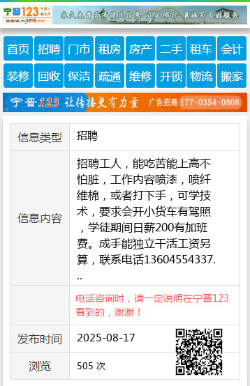 招聘工人,能吃苦能上高不怕脏,工作内容喷漆,喷纤维棉,或者打下手,可学技术,要求会开小货车有驾照,学徒期间日薪200有加班费。成手能独立干活工资另算,联系电话13604554337 【电话咨询时,请一定说明在望奎信息网看到的,谢谢!】 |