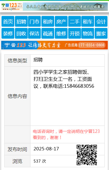 四小学学生之家招聘做饭、打扫卫生女工一名,工资面议,联系电话:15846683056
