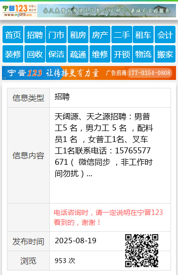 天阔源、天之源招聘:男普工5 名,男力工 5 名 ,配料员1 名 ,女普工1名、叉车工1名联系电话:15765577671( 微信同步 ,非工作时间勿扰) 【电话咨询时,请一定说明在望奎信息网看到的,谢谢!】 |