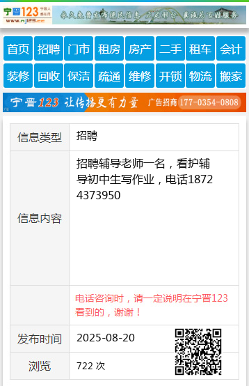 招聘辅导老师一名,看护辅导初中生写作业,电话18724373950