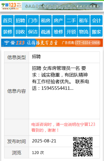 招聘 女库房管理员一名 要求:诚实稳重,有团队精神 有工作经验者优先。 联系电话:15945554411