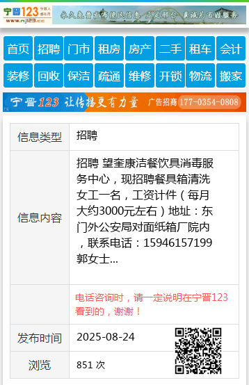 招聘 望奎康洁餐饮具消毒服务中心,现招聘餐具箱清洗女工一名,工资计件(每月大约3000元左右)地址:东门外公安局对面纸箱厂院内,联系电话:15946157199郭女士 【电话咨询时,请一定说明在望奎信息网看到的,谢谢!】 |