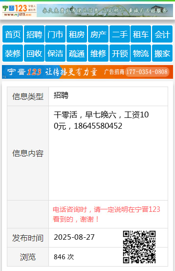 干零活,早七晚六,工资100元,18645580452