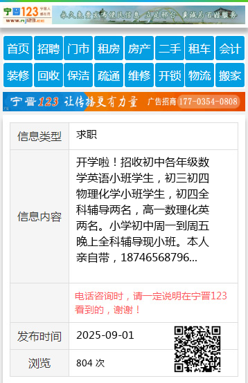 开学啦!招收初中各年级数学英语小班学生,初三初四物理化学小班学生,初四全科辅导两名,高一数理化英两名。小学初中周一到周五晚上全科辅导现小班。本人亲自带,18746568796 【电话咨询时,请一定说明在望奎信息网看到的,谢谢!】 |