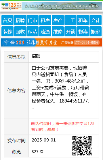 由于公司发展需要,现招聘县内送货司机(食品)人员一名。男,30岁-48岁之间,工资+提成+满勤,每月带薪假两天,中午供一顿饭,有经验者优先!18944551177 【电话咨询时,请一定说明在望奎信息网看到的,谢谢!】 |