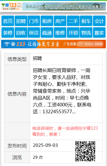 招聘长期白班育婴师,一周岁女宝,要求人品好、对孩子有耐心、勤快干净利索、带辅食带家务,地点:兴华尚品A区,时间:早七点晚六点,工资4000元,联系电话:13224553577