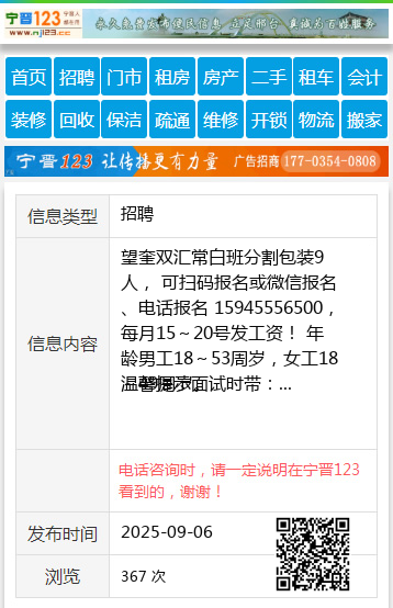 望奎双汇常白班分割包装9人, 可扫码报名或微信报名、电话报名 15945556500,每月15~20号发工资! 年龄男工18~53周岁,女工18~49周岁。