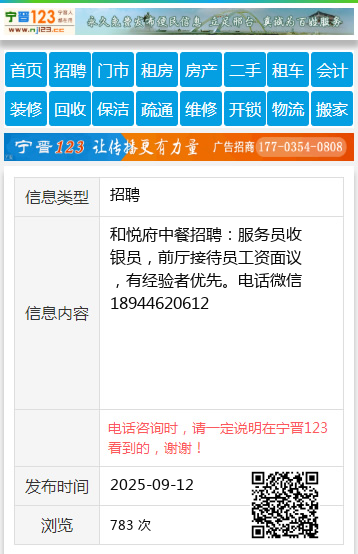 和悦府中餐招聘:服务员收银员,前厅接待员工资面议,有经验者优先。电话微信18944620612