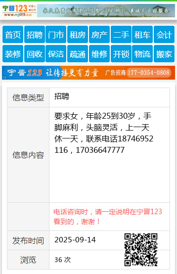 要求女,年龄25到30岁,手脚麻利,头脑灵活,上一天休一天,联系电话18746952116,17036647777