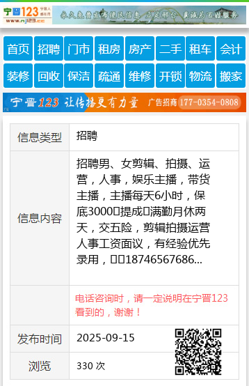 招聘男、女剪辑、拍摄、运营,人事,娱乐主播,带货主播,主播每天6小时,保底3000➕提成➕满勤月休两天,交五险,剪辑拍摄运营人事工资面议,有经验优先录用,☎️18746567686 【电话咨询时,请一定说明在望奎信息网看到的,谢谢!】 |