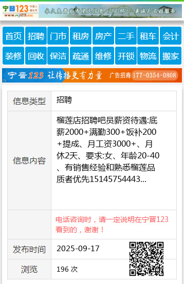榴莲店招聘吧员薪资待遇:底薪2000+满勤300+饭补200+提成、月工资3000+、月休2天、要求:女、年龄20-40、有销售经验和熟悉榴莲品质者优先15145754443 【电话咨询时,请一定说明在望奎信息网看到的,谢谢!】 |