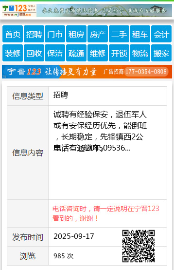 诚聘有经验保安,退伍军人或有安保经历优先,能倒班,长期稳定,先锋镇西2公里,有通勤车。 电话:19204509536