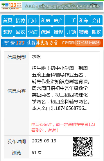 招生啦!初中小学周一到周五晚上全科辅导作业五名,辅导作业讲知识点刷题背课。周六周日招初中各年级数学英语两名,初三初四物理化学两名,初四全科辅导两名。本人亲自带18746568796 【电话咨询时,请一定说明在望奎信息网看到的,谢谢!】 |
