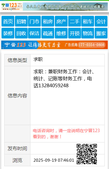 求职:兼职财务工作:会计、统计、记账等财务工作,电话13284059248
