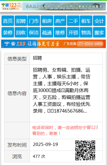 招聘男、女剪辑、拍摄、运营,人事,娱乐主播,带货主播,主播每天6小时,保底3000➕提成➕满勤月休两天,交五险,剪辑拍摄运营人事工资面议,有经验优先录用,☎️18746567686 【电话咨询时,请一定说明在望奎信息网看到的,谢谢!】 |