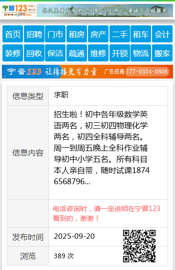招生啦!初中各年级数学英语两名,初三初四物理化学两名,初四全科辅导两名。周一到周五晚上全科作业辅导初中小学五名。所有科目本人亲自带,随时试课18746568796 【电话咨询时,请一定说明在望奎信息网看到的,谢谢!】 |