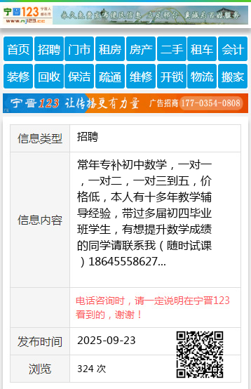 常年专补初中数学,一对一,一对二,一对三到五,价格低,本人有十多年教学辅导经验,带过多届初四毕业班学生,有想提升数学成绩的同学请联系我(随时试课)18645558627 【电话咨询时,请一定说明在望奎信息网看到的,谢谢!】 |