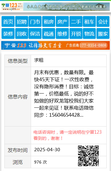 月末有优惠,数量有限。最快45天下证!一次性收费,没有隐形消费!目标:诚信第一,价格最低,说的好不如做的好双龙驾校我们大家一起来见证!联系电话微信同步:15604654428 【电话咨询时,请一定说明在望奎信息网看到的,谢谢!】 |