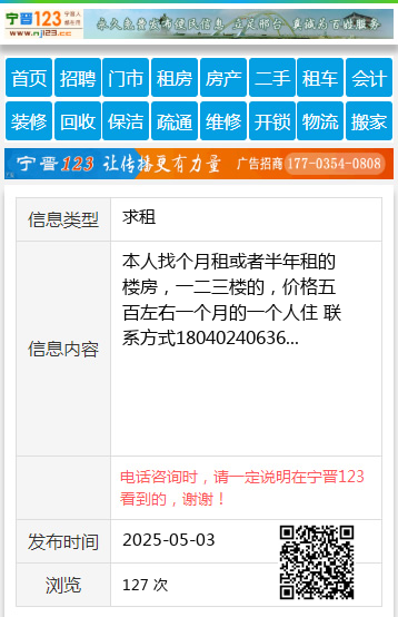 本人找个月租或者半年租的楼房,一二三楼的,价格五百左右一个月的一个人住 联系方式18040240636