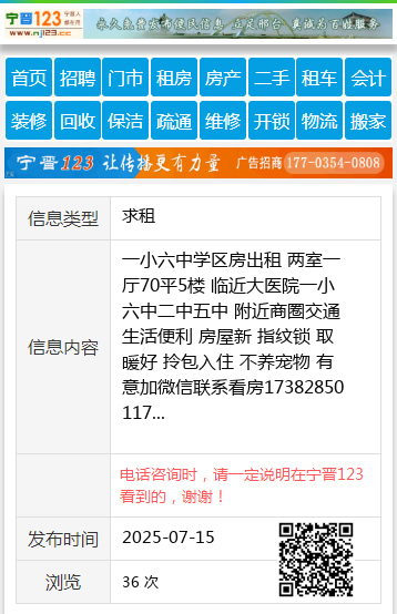 一小六中学区房出租 两室一厅70平5楼 临近大医院一小六中二中五中 附近商圈交通生活便利 房屋新 指纹锁 取暖好 拎包入住 不养宠物 有意加微信联系看房17382850117 【电话咨询时,请一定说明在望奎信息网看到的,谢谢!】 |